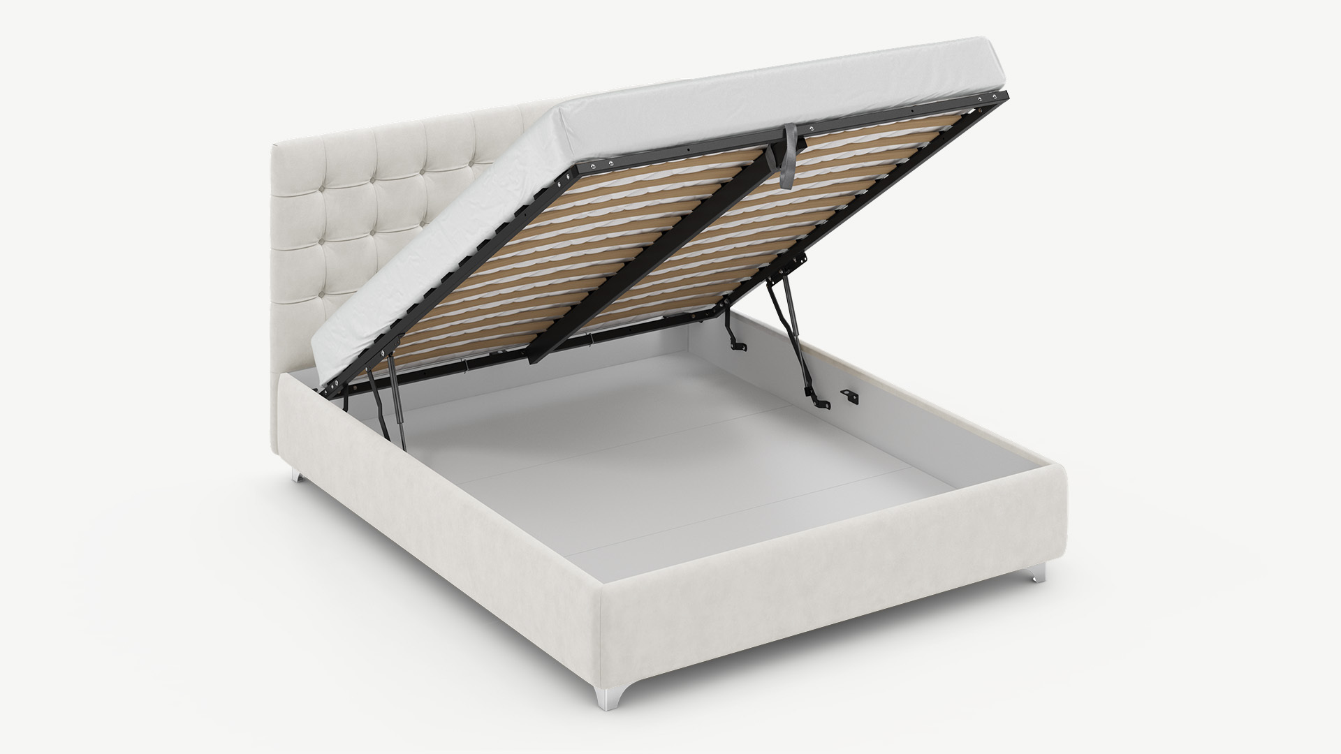 - Скрытая под основанием вместительная емкость без внутренних перегородок позволяет использовать всю площадь подкроватного пространства для хранения вещей.