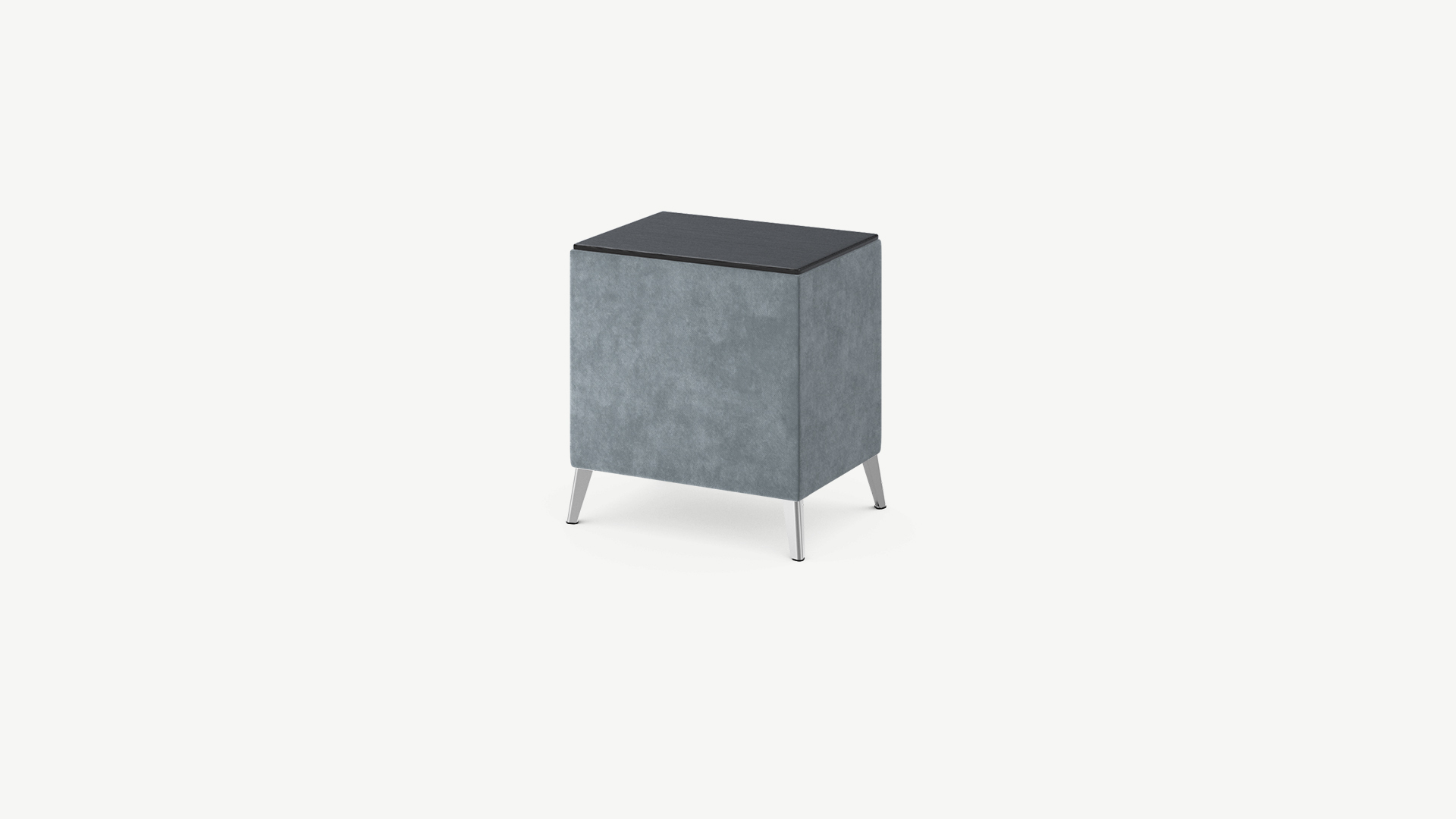 Обратная сторона тумбы, выполненная в обивочной ткани, позволяет ставить ее в центре комнаты и зонировать пространство.