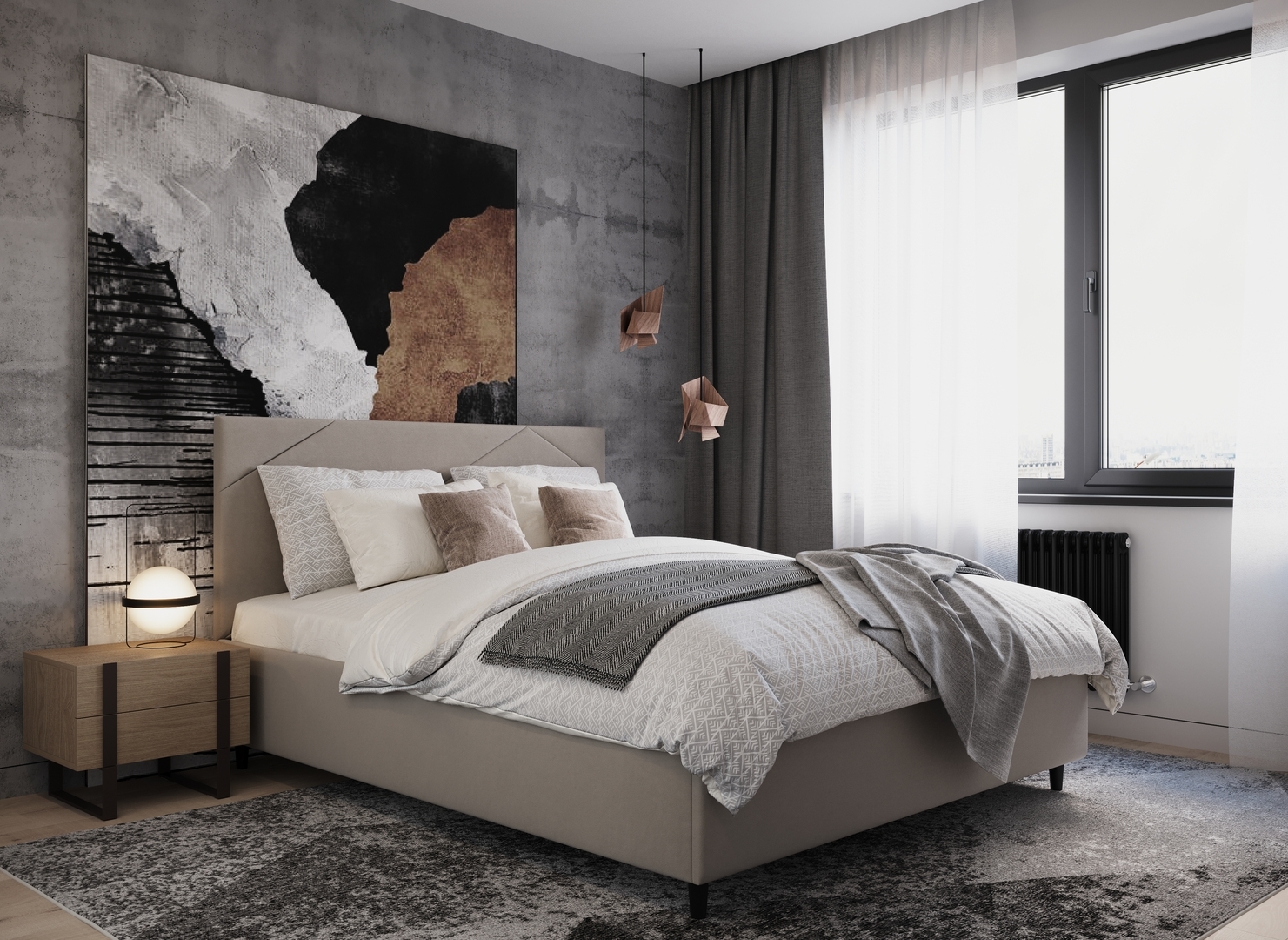 Элегантным и практичным акцентом служат скрытые карманы, расположенные по его углам. Лаконичные формы объемных царг создают единый гармоничный образ и фокусируют внимание на центральном текстурном элементе кровати.