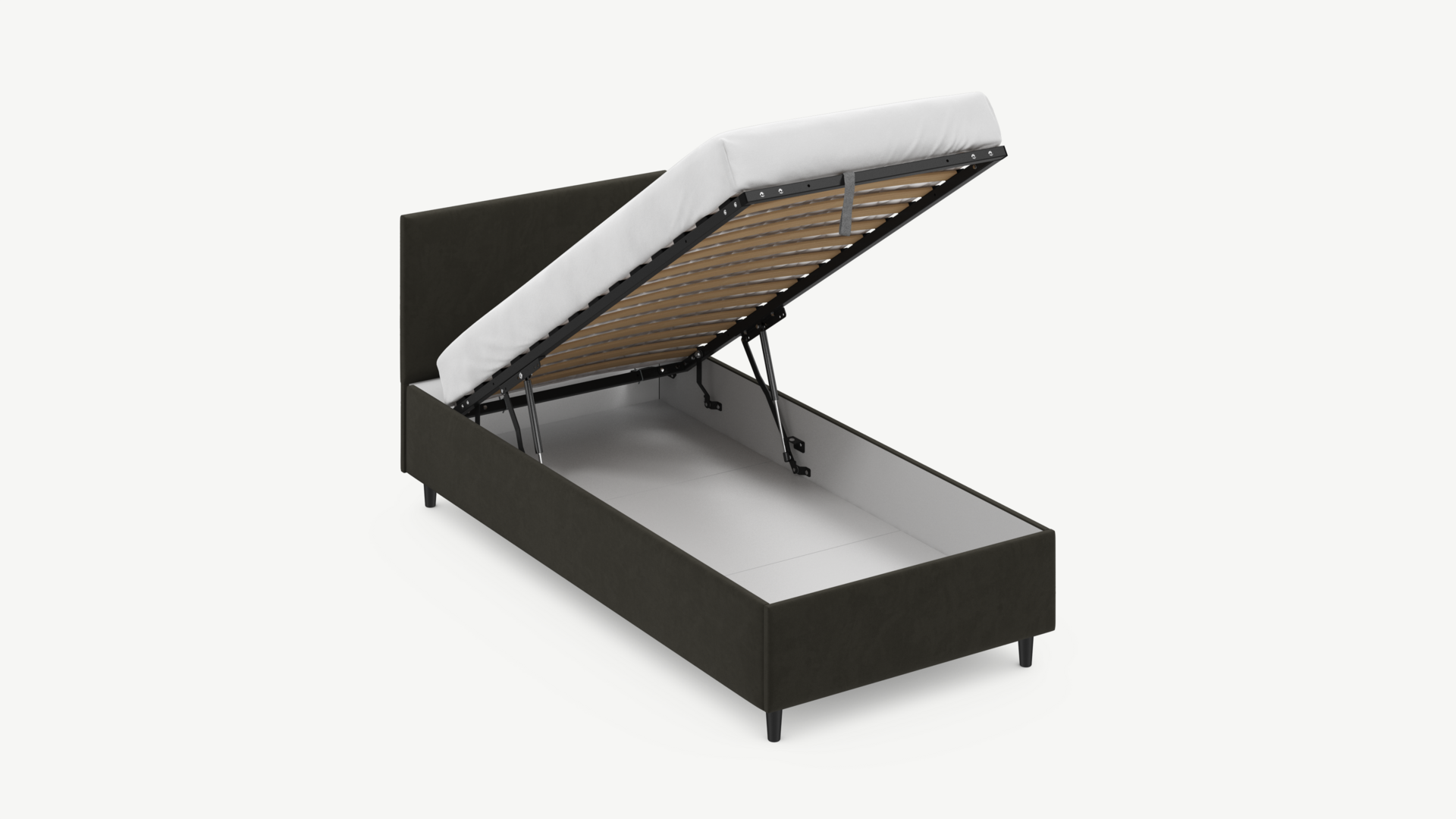 • Скрытая под основанием вместительная емкость без внутренних перегородок позволяет использовать всю площадь подкроватного пространства для хранения вещей.