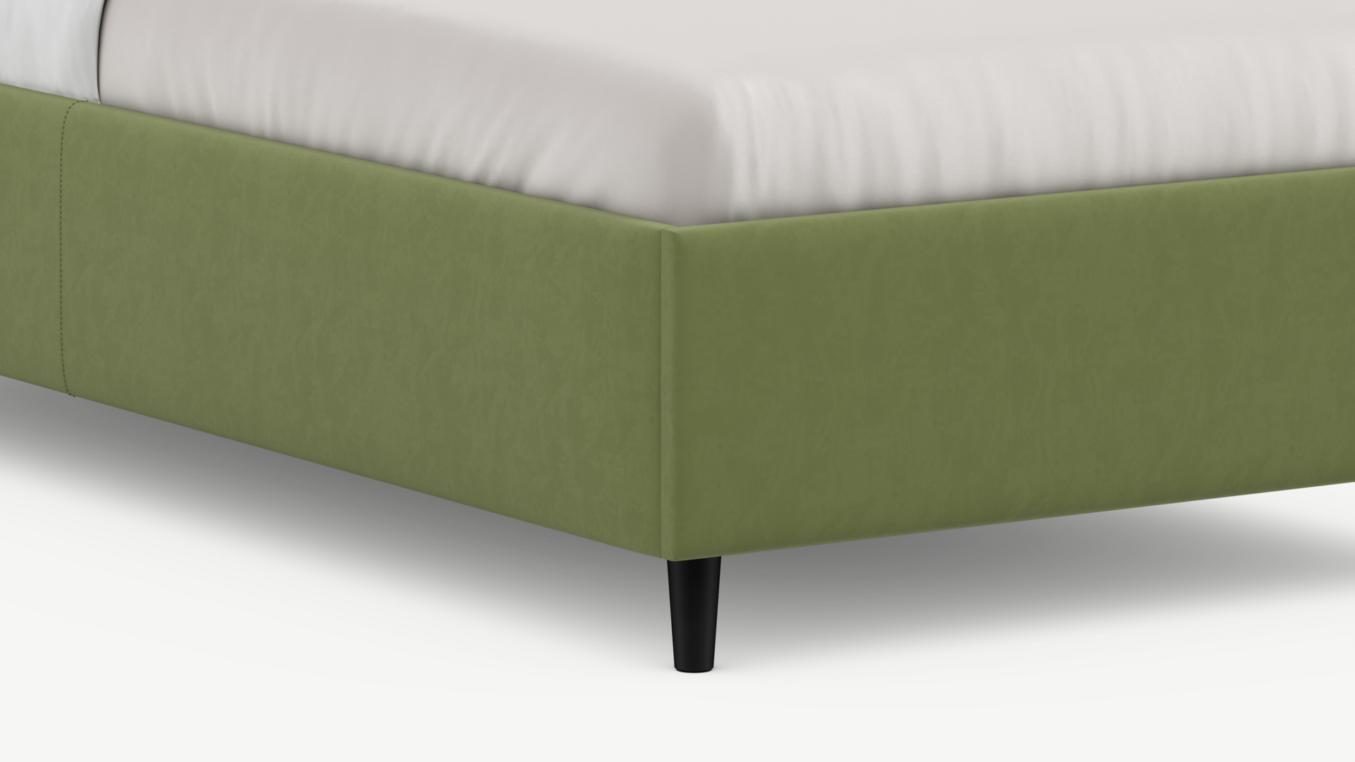 Царга, задающая пропорции, благодаря гладкости своей фактуры подчеркивает центральный элемент декора. Высокие опоры приподнимают фигуру кровати над полом и добавляют её образу визуальной легкости.