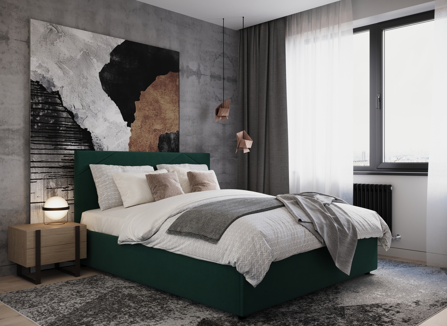 MOON FAMILY 1257 привлекает внимание оригинальным исполнением: широкие полосы ткани эффектно пересекают периметр изголовья, создавая на нем графический орнамент. Элегантным и практичным акцентом служат скрытые карманы, расположенные по его углам. Лаконичные формы объемных царг создают единый гармоничный образ и фокусируют внимание на центральном текстурном элементе кровати.