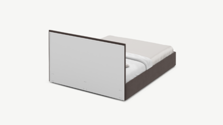 MOON FAMILY 1257 привлекает внимание оригинальным исполнением: широкие полосы ткани эффектно пересекают периметр изголовья, создавая на нем графический орнамент. Элегантным и практичным акцентом служат скрытые карманы, расположенные по его углам. Лаконичные формы объемных царг создают единый гармоничный образ и фокусируют внимание на центральном текстурном элементе кровати.