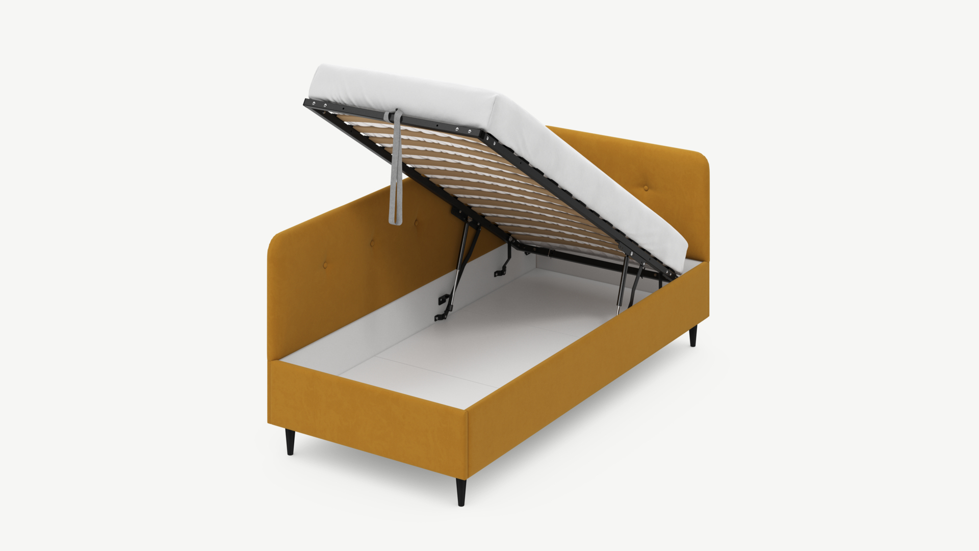 • Скрытая под основанием вместительная емкость без внутренних перегородок позволяет использовать всю площадь подкроватного пространства для хранения вещей.