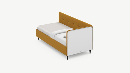 Угловая односпальная кровать MOON FAMILY 1253 с мягкой спинкой и изголовьем обладает округлыми формами, привносящими в интерьер нотки нежности. Изголовье, украшенное пуговицами, добавляет окружающему пространству шарм и уют. Высокие опоры придают кровати визуальной легкости, а также обеспечивают удобство во время уборки.