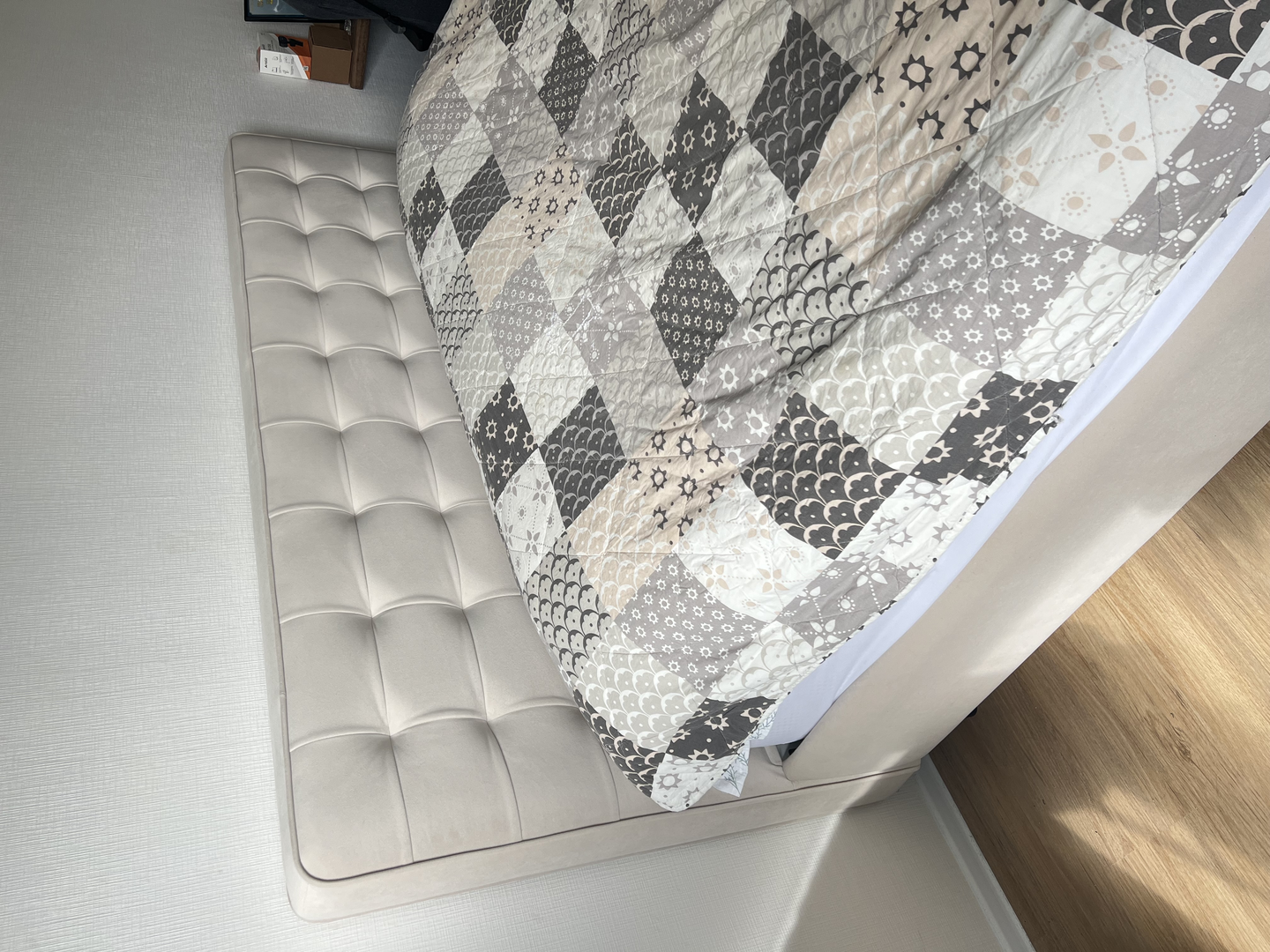 Заказали кровать с подушками-валиками, очень необычный дизайн нам показался. Выбрали высокие опоры для удобства в уборке, а изголовье не стали брать высокое, больше понравился низкий вариант. Приятно, что в магазине большой выбор тканей и цветов. Мы выбрали яркий бирюзовой, в нашей комнате кровать выглядит просто потрясающе! Кровать стала ярким акцентом. Это очень круто, что компания дает возможность сделать интерьер таким, как хочется. По качеству также нет претензий. Обита ровно, ни складок не, ни неровностей. Ламели ровные, матрас на них лежит идеально. Мы остались довольны, всем рекомендуем к покупке.